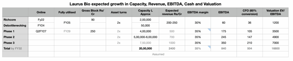 My assumption is Laurus Bio currently generates Rs. 35 Cr cash from operations, which would reach Rs. 100 Cr by FY29 and scale-up to Rs. 500 Cr by FY32. Which brings it to a CAGR of 45% between FY25 to FY32; in-line with the industry growth.
